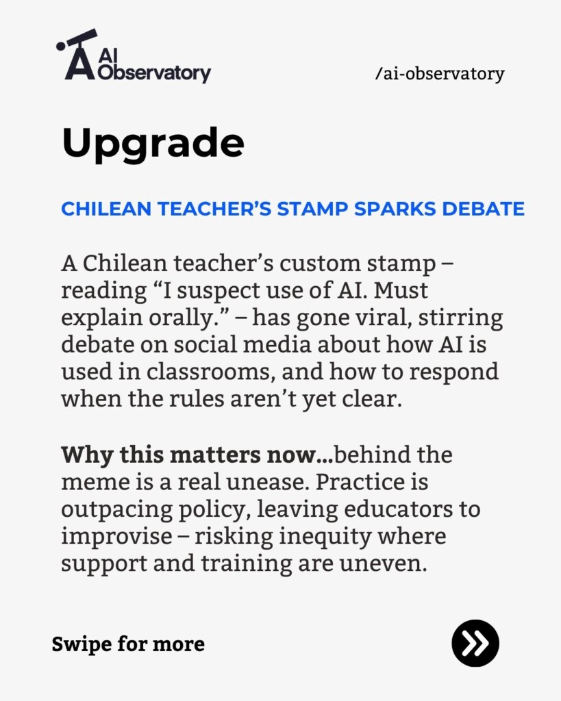 A Chilean teacher’s custom stamp – reading “I suspect use of AI. Must explain orally.” – has gone viral across Latin America, stirring debate on social media about how AI is used in classrooms, and how to respond when the rules aren’t yet clear. (Source: T13, 27th July 2025)