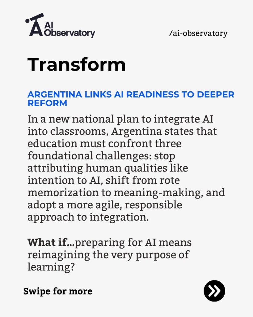 In a new national plan to integrate AI into classrooms, Argentina argues that education must confront three foundational challenges: stop attributing human qualities like intention to AI (narrative), shift from rote memorization to meaning-making (model), and adopt a more agile, responsible approach to integration (paradigm). (Source: Official website of the Argentine State, 25th July 2025)