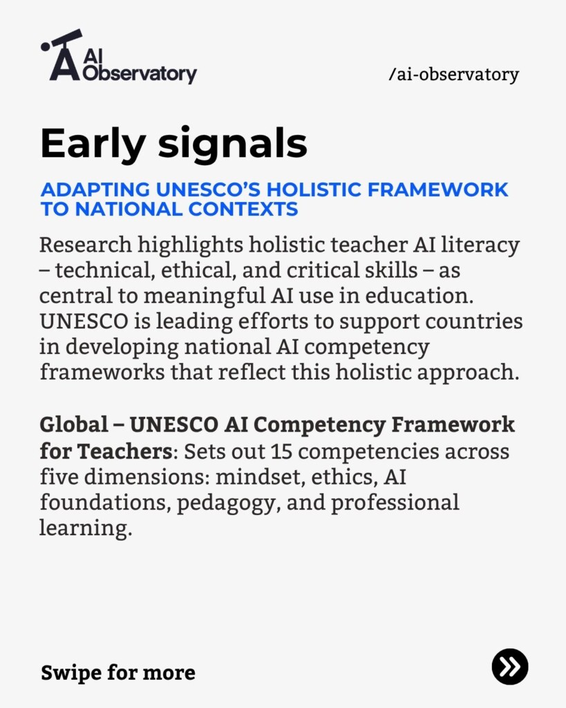 Research highlights holistic teacher AI literacy – technical, ethical, and critical skills – as central to meaningful AI use in education (Iryna, 2025; Long and Magerko, 2020; Ng et al., 2021). UNESCO is leading efforts to support countries in developing national AI competency frameworks that reflect this holistic approach.