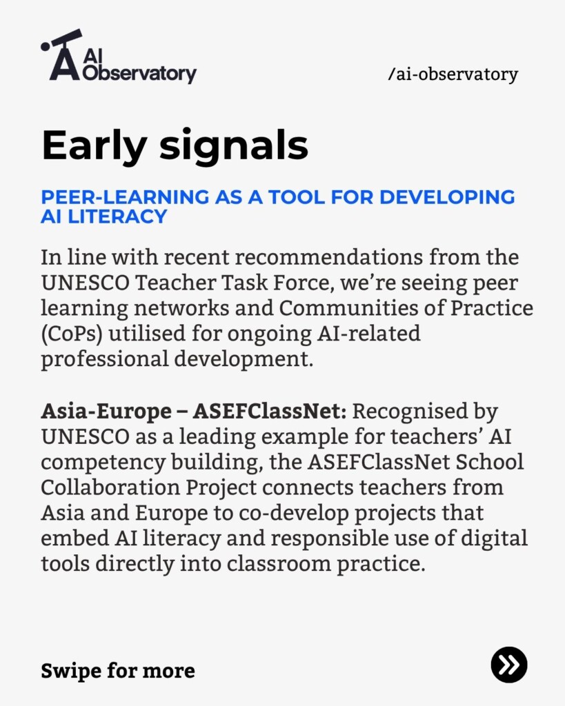 - Asia-Europe – ASEFClassNet: Recognised by UNESCO as a leading example for teachers’ AI competency building, the ASEFClassNet School Collaboration Project connects teachers from Asia and Europe to co-develop projects that embed AI literacy and responsible use of digital tools directly into classroom practice. (ASEFClassNet, 2025)
