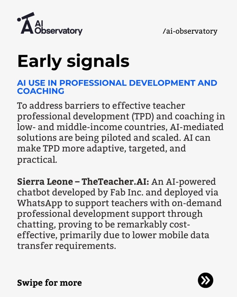 - Sierra Leone – TheTeacher.AI: An AI-powered chatbot developed by Fab Inc. and deployed via WhatsApp to support teachers with on-demand professional development support through chatting, proving to be remarkably cost-effective, primarily due to lower mobile data transfer requirements. (TheTeacher.AI)