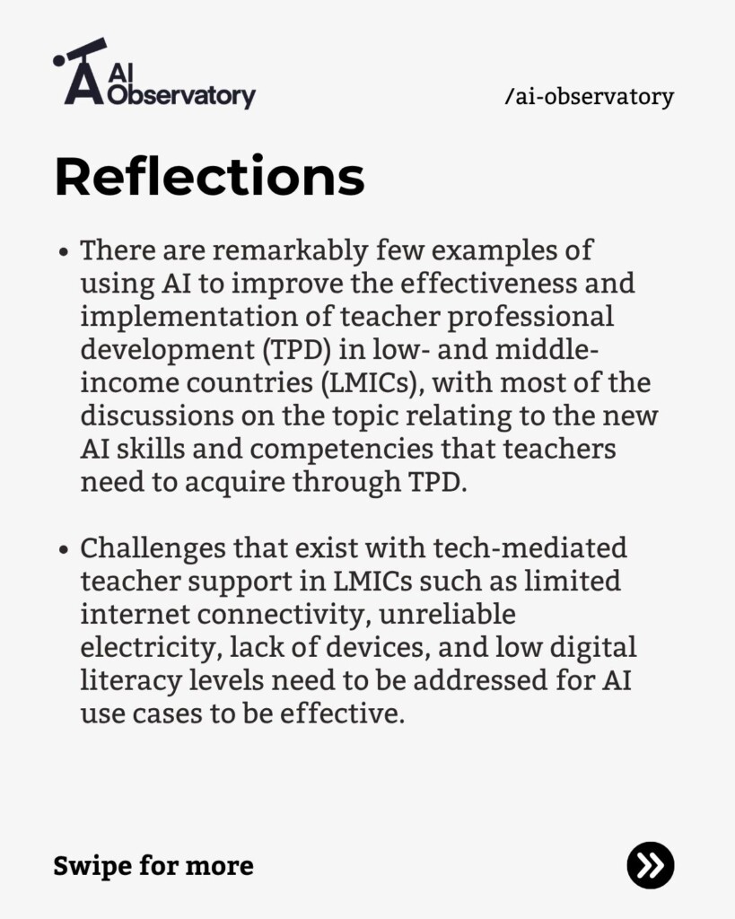 - There are remarkably few examples of using AI to improve the effectiveness and implementation of teacher professional development (TPD) in low- and middle-income countries (LMICs), with most of the discussions on the topic relating to the new AI skills and competencies that teachers need to acquire through TPD.