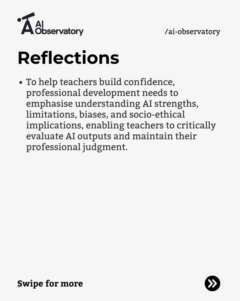 - To help teachers build confidence, professional development needs to emphasise understanding AI strengths, limitations, biases, and socio-ethical implications, enabling teachers to critically evaluate AI outputs and maintain their professional judgment.