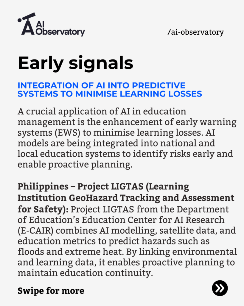 - Philippines – Project LIGTAS (Learning Institution GeoHazard Tracking and Assessment for Safety): Project LIGTAS from the Department of Education’s Education Center for AI Research (E-CAIR) combines AI modelling, satellite data, and education metrics to predict hazards such as floods and extreme heat. By linking environmental and learning data, it enables proactive planning to maintain education continuity. (PIDS–UP Forum, 2025)