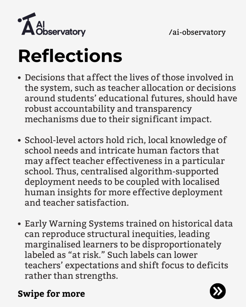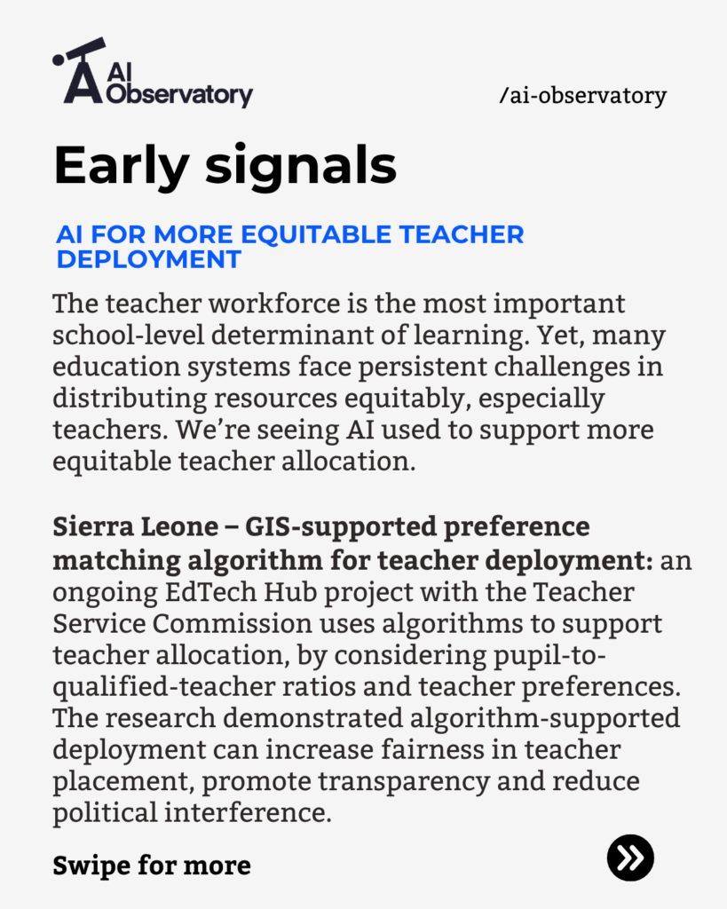 The teacher workforce is the most important school-level determinant of learning. However, many education systems face persistent challenges in distributing resources equitably, especially teachers (World Bank, 2024). We’re seeing AI used to support more equitable teacher allocation.