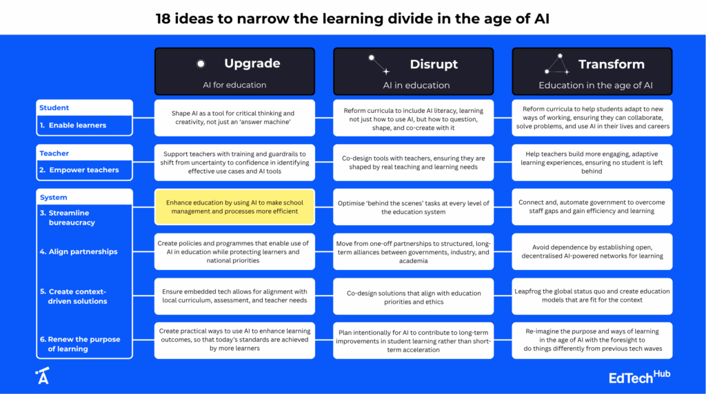 EdTech Hub’s AI Observatory is exploring how ministries of education can streamline bureaucracy. This means simplifying administrative procedures to ensure that information, decisions, approvals, and resource allocations move more efficiently through the system.