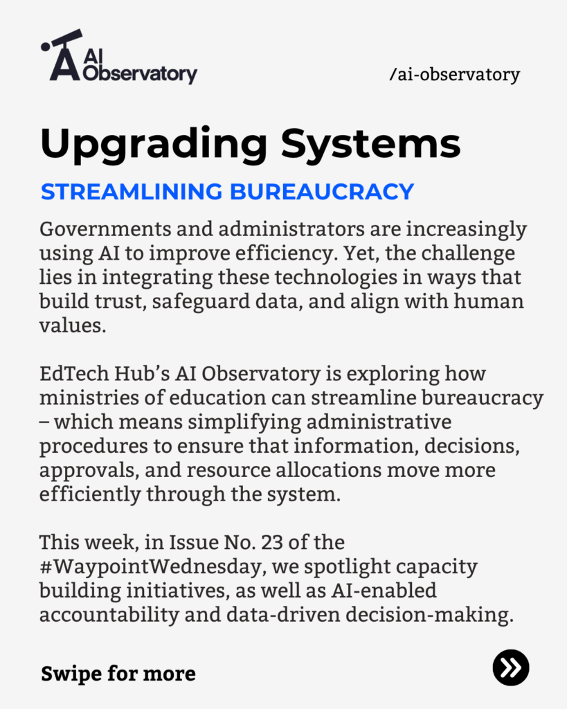EdTech Hub’s AI Observatory is exploring how ministries of education can streamline bureaucracy – which means simplifying administrative procedures to ensure that information, decisions, approvals, and resource allocations move more efficiently through the system.