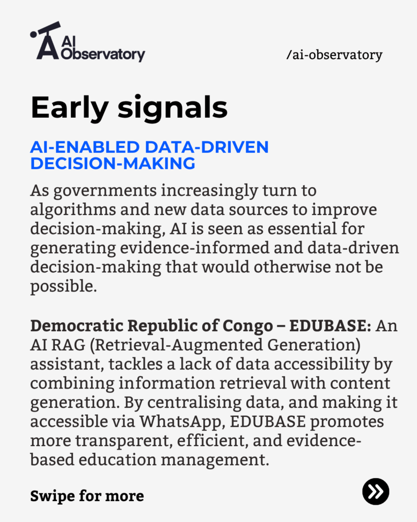 - Democratic Republic of Congo – EDUBASE: An AI RAG (Retrieval-Augmented Generation) assistant, tackles a lack of data accessibility by combining information retrieval with content generation. By centralising data, and making it accessible via WhatsApp, EDUBASE promotes more transparent, efficient, and evidence-based education management. (UNESCO, 2025)