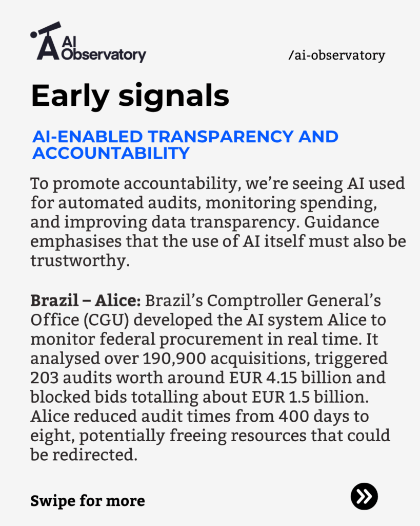 - Brazil – Alice: Brazil’s Comptroller General’s Office (CGU) developed the AI system Alice to monitor federal procurement in real time. It analysed over 190,900 acquisitions, triggered 203 audits worth around EUR 4.15 billion and blocked bids totalling about EUR 1.5 billion. Alice reduced audit times from 400 days to eight, potentially freeing resources that could be redirected. (OPSI, 2024)