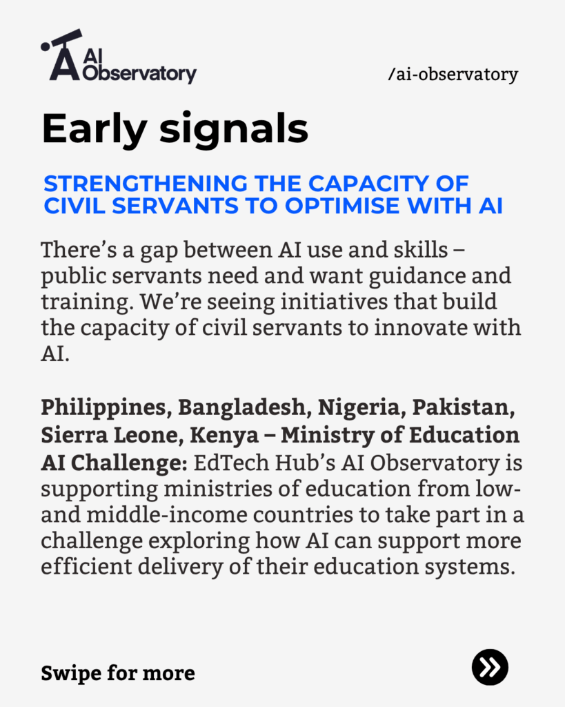 - Philippines, Bangladesh, Nigeria, Pakistan, Sierra Leone, Kenya – Ministry of Education AI Challenge: EdTech Hub’s AI Observatory is supporting ministries of education from low- and middle-income countries to take part in a challenge exploring how AI can support more efficient delivery of their education systems. (EdTech Hub, 2025)