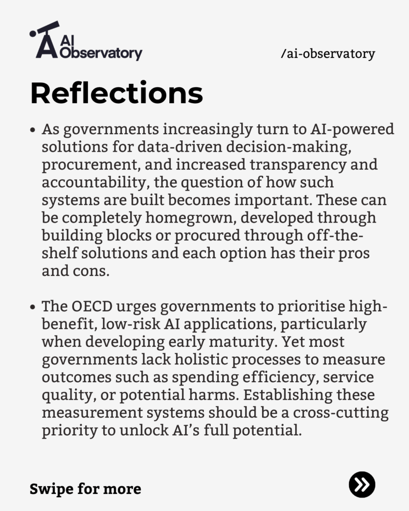 - The OECD urges governments to prioritise high-benefit, low-risk AI applications, particularly when developing early maturity. Yet most governments lack holistic processes to measure outcomes such as spending efficiency, service quality, or potential harms. Establishing these measurement systems should be a cross-cutting priority to unlock AI’s full potential. (OECD, 2025)