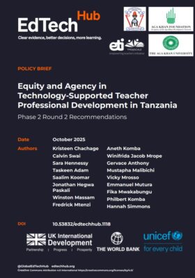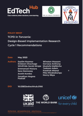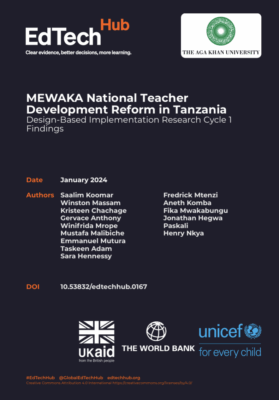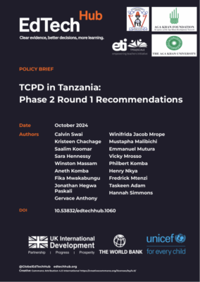 This study represents embedded research with the Government of Tanzania on implementing and optimising teacher professional development (TPD) reform at national scale in a low- or lower-middle-income country using digital technology. There is a recognised need for more effective, sustainable, and scalable models that leverage digital tools for TPD while establishing clear links to learner outcomes. This study aims to address these evidence gaps through implementation research and participatory methods. EdTech Hub worked in partnership with Tanzania Institute for Education (TIE), Aga Khan University Institute for Educational Development (AKU-IED), and Aga Khan Foundation (AKF).