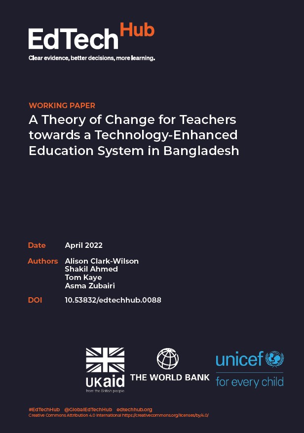 Clark-Wilson, A., Ahmed, S., Kaye, T., & Zubairi, A. (2022). A Theory of Change for Teachers Towards a Technology-Enhanced Education System in Bangladesh (No. 44). EdTech Hub. https://doi.org/10.53832/edtechhub.0088. Available at https://docs.edtechhub.org/lib/29Z2JFJT