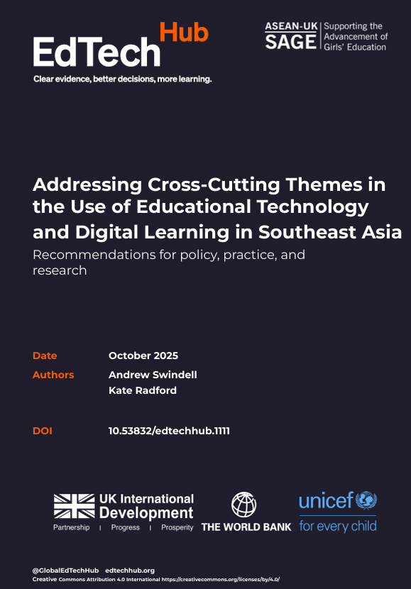 Swindell, A., & Radford, K. (2025). Addressing Cross-Cutting Themes in the Use of Education Technology and Digital Learning in Southeast Asia: Recommendations for policy, practice, and research. EdTech Hub. https://doi.org/10.53832/edtechhub.1111