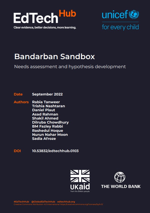 Tanweer, R., Nashtaran, T., Plaut, D., Rahman, A., Ahmed, S., Chowdhury, D., Rabbi, B. F., Hoque, R., Nahar, N., & Afroze, S. (2022). Bandarban Sandbox: Needs assessment and hypothesis development. EdTech Hub. https://doi.org/10.53832/edtechhub.0103. Available at https://docs.edtechhub.org/lib/77665EVG