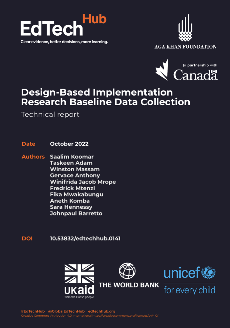 Koomar, S., Adam, T., Massam, W. E., Anthony, G., Mrope, W. J., Mtenzi, F., Mwakabungu, F., Komba, A., Hennessy, S., & Barretto, J. (2022). Design-Based Implementation Research Baseline Data Collection: Technical report [Technical Report]. EdTech Hub. https://doi.org/10.53832/edtechhub.0141