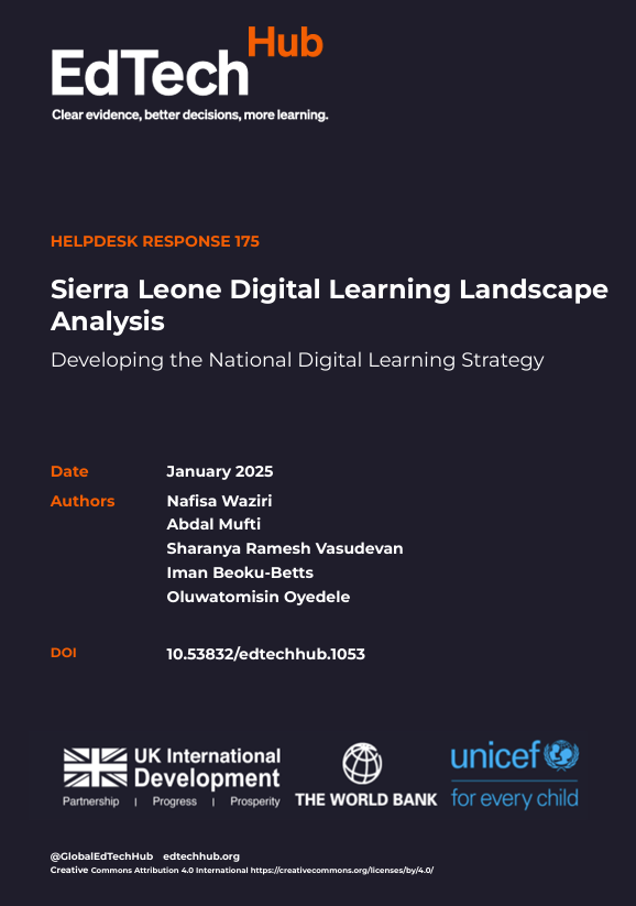 Waziri, N., Mufti, A., Ramesh Vasudevan, S., Beoku-Betts, I., & Oyedele, O. (2025). Sierra Leone Digital Learning Landscape Analysis: Developing the National Digital Learning Strategy (No. 175). EdTech Hub. https://doi.org/10.53832/edtechhub.1053