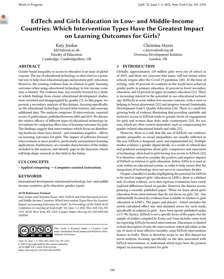 Katy Jordan and Christina Myers. 2022. EdTech and Girls Education in Lowand Middle-Income Countries: Which Intervention Types Have the Greatest Impact on Learning Outcomes for Girls?. In Proceedings of the Ninth ACM Conference on Learning @ Scale (L@S ’22), June 1–3, 2022, New York City, NY,