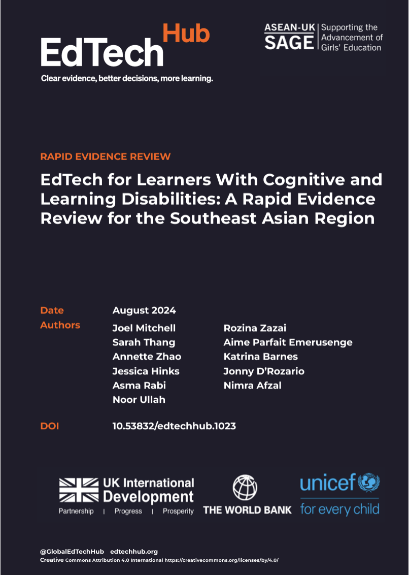 Mitchell, J., Thang, S., Zhao, A., Hinks, J., Rabi, A., Ullah, N., Zazai, R., Emerusenge, A. P., Barnes, K., D’Rozario, J., & Afzal, N. (2024). EdTech for Learners With Cognitive and Learning Disabilities: A Rapid Evidence Review for the Southeast Asian Region [Rapid Evidence Review]. EdTech Hub. https://doi.org/10.53832/edtechhub.1023