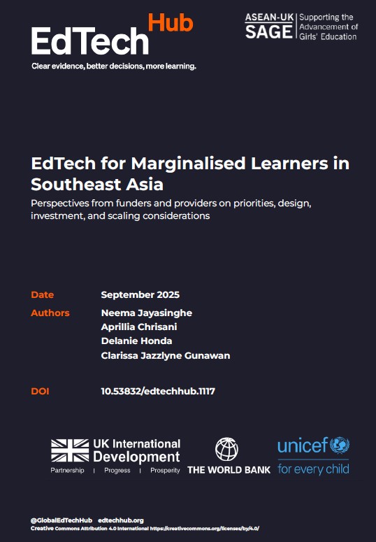 Jayasinghe, N., Chrisani, A., Honda, D., & Gunawan, C. J. (2025). EdTech for Marginalised Learners in Southeast Asia: Perspectives from funders and providers on priorities, design, investment, and scaling considerations. EdTech Hub. https://doi.org/10.53832/edtechhub.1117. Available at https://docs.edtechhub.org/lib/SB7G3I83