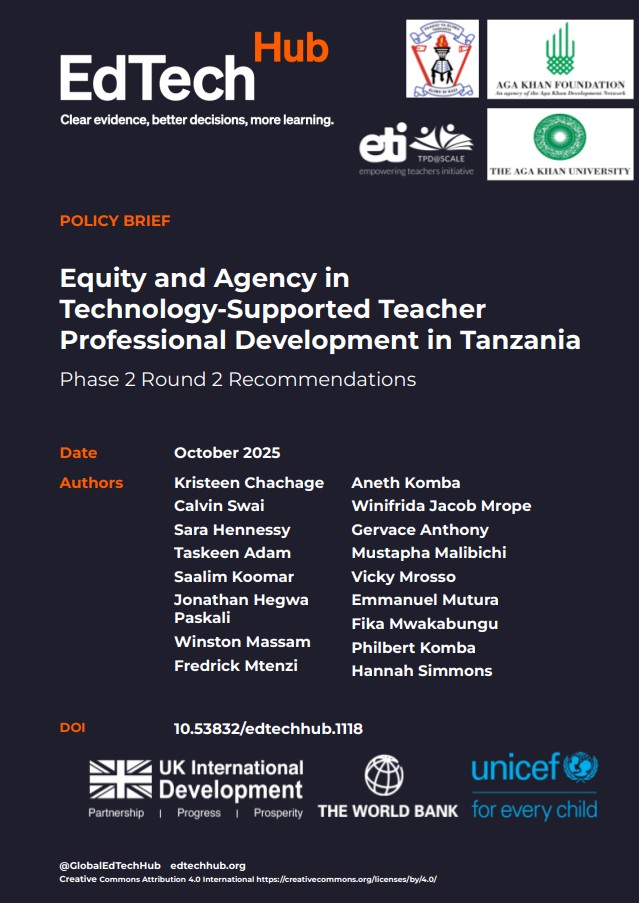 Chachage, K., Swai, C., Hennessy, S., Adam, T., Koomar, S., Paskali, J. H., Massam, W., Mtenzi, F., Komba, A., Jacob Mrope, W., Anthony, G., Malibiche, M., Mrosso, V., Mutura, E., Mwakabungu, F., Komba, P., & Simmons, H. (2025). Equity and Agency in Technology-Supported Teacher Professional Development in Tanzania: Phase 2 Round 2 Recommendations. EdTech Hub. https://doi.org/10.53832/edtechhub.1118. Available at https://docs.edtechhub.org/lib/ZXGZK3XS