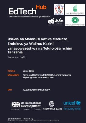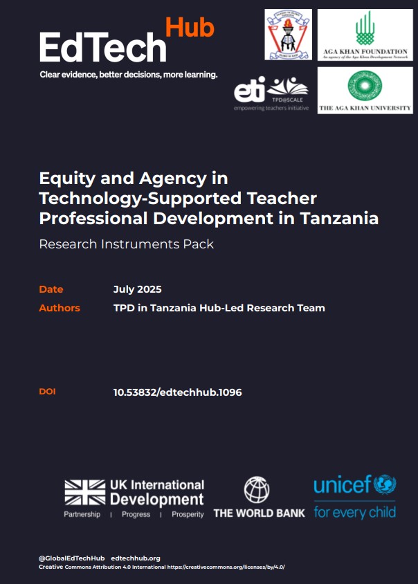 Chachage, K., Hennessy, S., Koomar, S., Swai, C., Massam, W., Jacob, W., Anthony, G., Malibiche, M., Mutura, E., Adam, T., Mwakabungu, F., Mrosso, V., Komba, P., & Mtenzi, F. (2025). Equity and Agency in Technology-Supported Teacher Professional Development in Tanzania: Research Instruments Pack. EdTech Hub. https://doi.org/10.53832/edtechhub.1096. Available at https://docs.edtechhub.org/lib/9DMTVDDG.