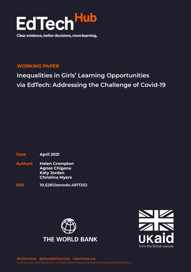 Crompton, H., Chigona, A., Jordan, Katy, J., & Myers, C. (2021). Inequalities in Girls’ Learning Opportunities via EdTech: Addressing the Challenge of Covid-19 (No. 31). EdTech Hub. https://doi.org/10.5281/zenodo.4917252. Available at https://docs.edtechhub.org/lib/D6PWMC4I.