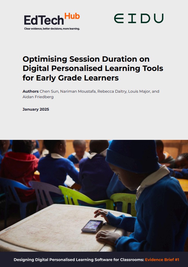 Sun, C., Moustafa, N., Daltry, R., Major, L., & Friedberg, A. (2025). Optimising Session Duration on Digital Personalised Learning Tools for Early Grade Learners (Evidence Brief No. 1). EdTech Hub. https://doi.org/10.53832/edtechhub.1046.