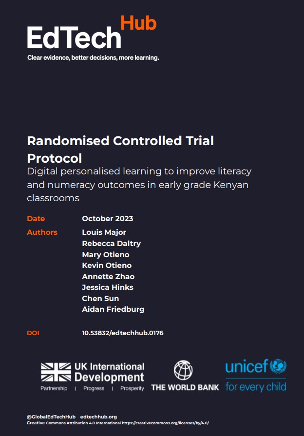 Major, L., Daltry, R., Otieno, M., Otieno, K., Zhao, A., Hinks, J., Sun, C., & Friedburg, A. (2023). Randomised Controlled Trial Protocol: Digital personalised learning to improve literacy and numeracy outcomes in Kenyan classrooms [Methodology publication]. EdTech Hub. https://doi.org/10.53832/edtechhub.0176