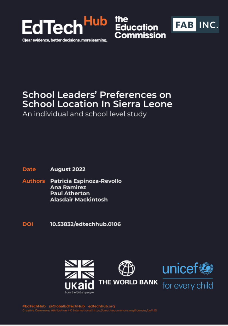 Espinoza-Revollo, P., Ramirez, A., Atherton, P., & Mackintosh, A. (2022). School Leaders’ Preferences on School Location in Sierra Leone: An individual and school-level study. EdTech Hub. https://doi.org/10.53832/edtechhub.0106