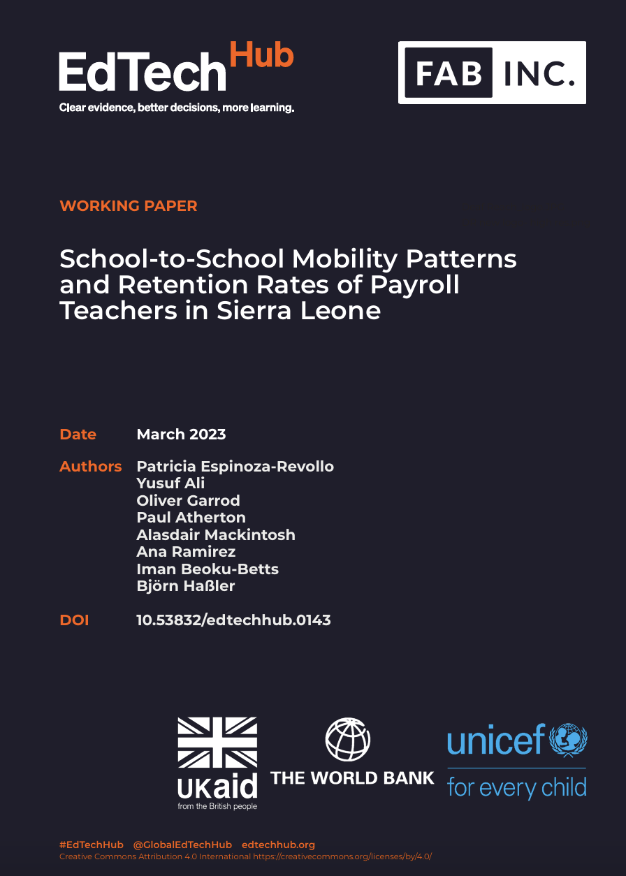 Espinoza-Revollo, P., Ali, Y., Garrod, O., Atherton, P., Mackintosh, A., Ramirez, A., Beoku-Betts, I., & Haßler, B. (2023). School-to-School Mobility Patterns and Retention Rates of Payroll Teachers in Sierra Leone (No. 48). EdTech Hub. https://doi.org/10.53832/edtechhub.0143