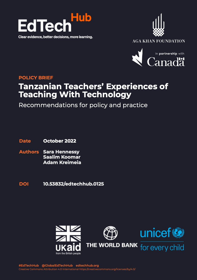 Hennessy, S., Koomar, S., & Kreimeia, A. (2022). Tanzanian Teachers’ Experiences of Teaching With Technology: Recommendations for policy and practice. EdTech Hub. https://doi.org/10.53832/edtechhub.0125