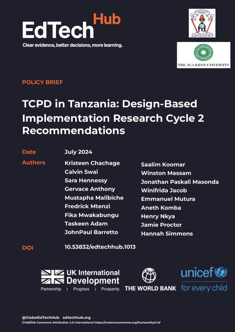Chachage, K., Koomar, S., Swai, C., Massam, W., Hennessy, S., Masonda, J. P., Anthony, G., Mrope, W. J., Malibiche, M., Mutura, E., Mtenzi, F., Komba, A., Mwakabungu, F., Nkya, H., Adam, T., Proctor, J., Barretto, J., & Simmons, H. (2024). TCPD in Tanzania: Design-Based Implementation Research Cycle 2 Recommendations. EdTech Hub. https://doi.org/10.53832/edtechhub.1013
