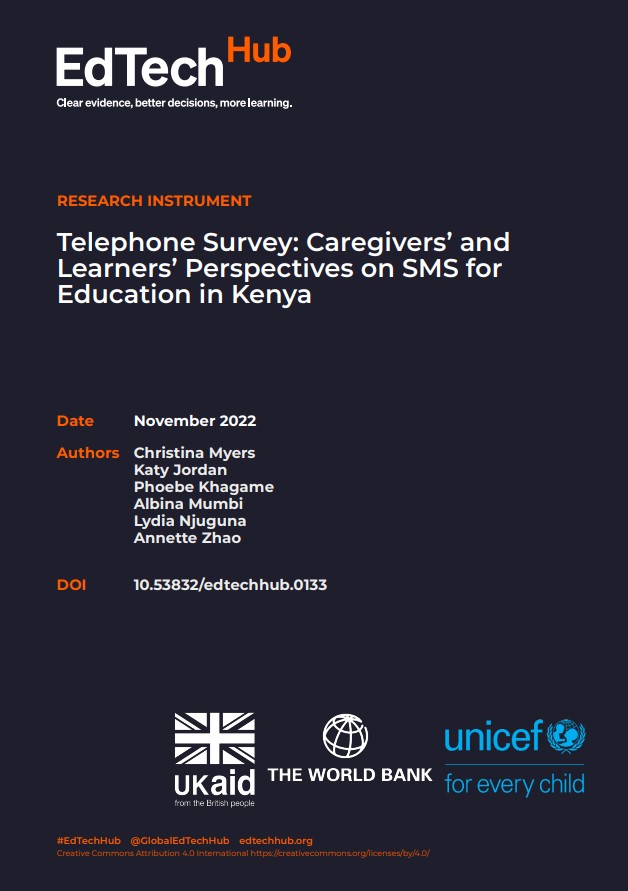 Myers, C., Jordan, K., Khagame, P., Mumbi, A., Njuguna, L., & Zhao, A. (2022). Telephone Survey: Caregivers’ and Learners’ Perspectives on SMS for Education in Kenya. EdTech Hub. https://doi.org/10.53832/edtechhub.0133. Available at https://docs.edtechhub.org/lib/NP52QFM8.