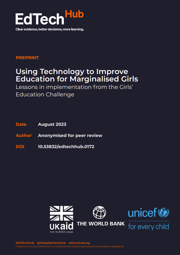 Anonymised for Peer Review Purposes. (2023). Using Technology to Improve Education for Marginalised Girls: Lessons in implementation from the Girls’ Education Challenge. EdTech Hub. https://doi.org/10.53832/edtechhub.0172
